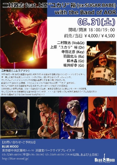 いやぁ〜、今日はほんと暑かったですねぇ〜。 思わずクーラー点けようか迷ってしまった程w。 今年は冷夏になると先日ニュースで報じられていましたけど、正直ほんまかいな?と・・・。 僕は冷夏を切に希望しまぁ〜す。 僕暑のいの超苦手なんですぅ〜・・・。 さてさて、ひっさびさにYouTubeに動画を追加しました。 昨年11月23日に高松OLIVE HALLで行いました 二村敦志feat東原力哉ライブの模様から、僕の1stアルバムに収録されているライブでもお馴染みの「Promised Land」でございます。 力哉さん、かつきさんのスリリングでアグレッシブなリズムセクション、80年代アメリカンMusicを踏襲したギターワーク、そして浪速のDavid Foster中山さんのキーボードワーク・・・これぞ大阪AORでございます(笑)。 やっぱりみんな関西人なので、コッテコテの関西AORにしかなっちゃうんですよねぇ〜www。 そんな動画はコチラからご覧くださいませませッ!! 勿論この「Promised Lan」は今週土曜日の東京・汐留Blue Moodで行いますライブ、そして来月14日(土)の地元大阪は梅田Mister Kelly'sでのライブでも演奏しますので、是非是非生で見ちゃって聞いちゃって感じちゃってくださいねぇ〜。 大阪ライブは動画と同じメンバーでお届けします(^-^) 両公演詳細は以下をご参照くださいねッ!! 皆様のご来場心よりお待ち申し上げておりますぅ〜♥ ■5月31日(土) ★超オススメ!!★ 〜二村敦志feat上原“ユカリ”裕(ex SUGAR BABE)〜 @汐留『Blue Mood』 http://blue-mood.jp/schedule/index.html 東京都中央区築地5-6-10 浜離宮パークサイドプレイス1F TEL:03-3249-6010(平日9:00-18:00) 03-3549-6010(平日18:00以降、及び土日祝日) The BAND:二村敦志(Vo&Gt)、上原“ユカリ”裕(Dr)、羽田北斗(Ba) 寺田正彦(Key)、鈴木晶(Gt)、坂井好幸(Gt) 開場/開演 18:00/19:00 前売り/当日 ¥4,000/¥4,500 ※前売りチケットのご予約・ご購入は二村敦志(atsushinimura@yahoo.co.jp)にメールを送って頂くか、『BLUE MOOD』まで 直接お電話、又はインターネット予約をお願い致します。 ■6月14日(土) ★超オススメ!!★ 〜二村敦志feat東原力哉(from NANIWA EXP)〜 @梅田『Mister Kelly's』 http://www.misterkellys.co.jp/ 大阪府大阪市北区曽根崎新地2-4-1 ホテルビスタプレミオ堂島1F TEL:06-6342-5821 The BAND:二村敦志(Vo&Gt)、東原力哉(Dr)、中島かつき(Ba) 中山智義(Key)、池田定男(Gt)、坂井好幸(Gt) 開場 18:00 開演 1st 19:30〜/2nd 21:00〜(※2stage制/入替無し) 前売り/当日 ¥4,000/¥4,500(※前売りは前日までの予約対応となります) ご予約・ご購入:二村敦志HP (http://www.atsushinimura.com/contact.html) Mister Kelly's HP (http://www.revn.jp/mk/pub/pc/schedule.php) ※チケットの前売りはございませんので、二村敦志宛(atsushinimura@yahoo.co.jp)にご予約メールを送って頂くか、『Mister Kelly's』まで直接お電話、又はインターネット予約をお願い致します。 ・・・・・・・・・・・・・・・・・・・・・・・・・・・・・・・・・・・・・・ ■7月12日(土)〜蔵コンサート〜 @能登半島『シーサイドヴィラ渤海』 http://www.bokkai.jp/ 石川県羽咋郡志賀町富来領家町甲の59 TEL:076-742-8080 開演 19:00〜 代金 ¥5,000(お食事代&ドリンク代込) ※ご宿泊の方は ¥11,000(ご宿泊代&ライブ代込、朝食付) ■7月13日(日) @河北『ホリ牧場 夢ミルク館』 http://www.yume-milk.com 石川県河北郡内灘町字湖西243 TEL: 076-258-6850 START 19:00 開演 19:00〜 チケット代 ¥1,500 ■7月19日(土) @和歌山『OLD TIME』 http://www.first-take.co.jp/oldtime/main.cgi 和歌山県和歌山市北新5丁目70 ひめビル1 TEL:073-428-1950 開場/開演 18:00/19:00 チケット代 ¥2,000(Drink代別) ■9月15日(月・祝) @山陽小野田(山口)『リカーショップWAKAYAMA』 http://r.goope.jp/wakayama 山口県山陽小野田市港町8-3 TEL:0836-83-6761 開場/開演 18:00/19:00 前売り/当日 ¥2,300/¥2,800(1Drink代込)