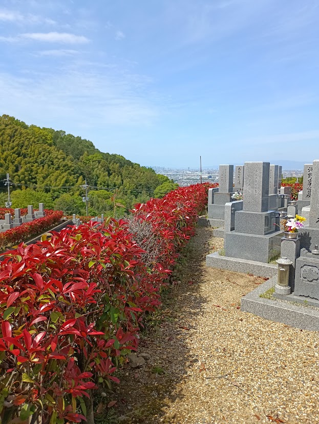 真っ赤な新芽が出た垣根で彩られて、青い空とマッチ。