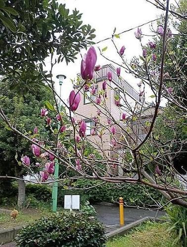会場のそばには、紫モクレンが咲いてた。
