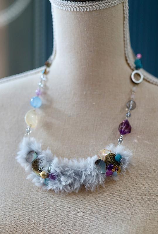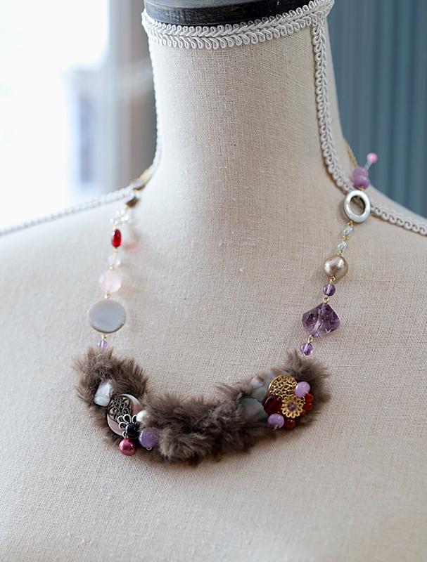ファーヤーンを編んで土台を作り、その上にハートや石を乗せていきます。