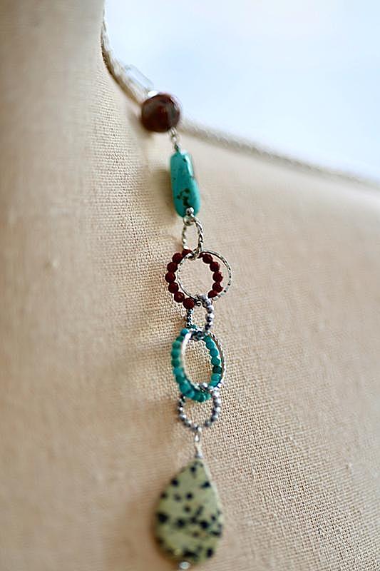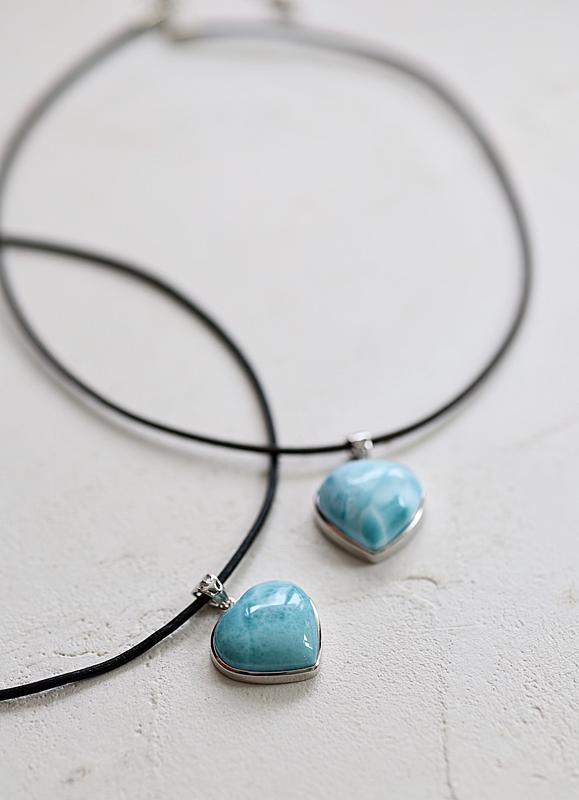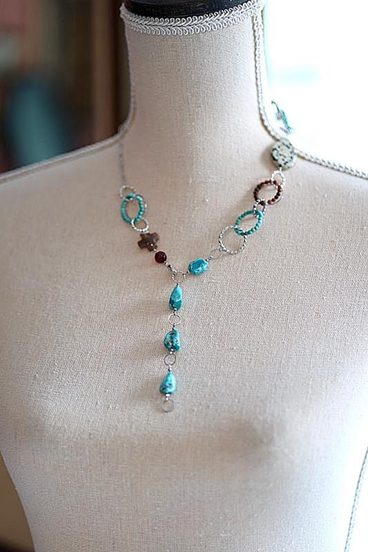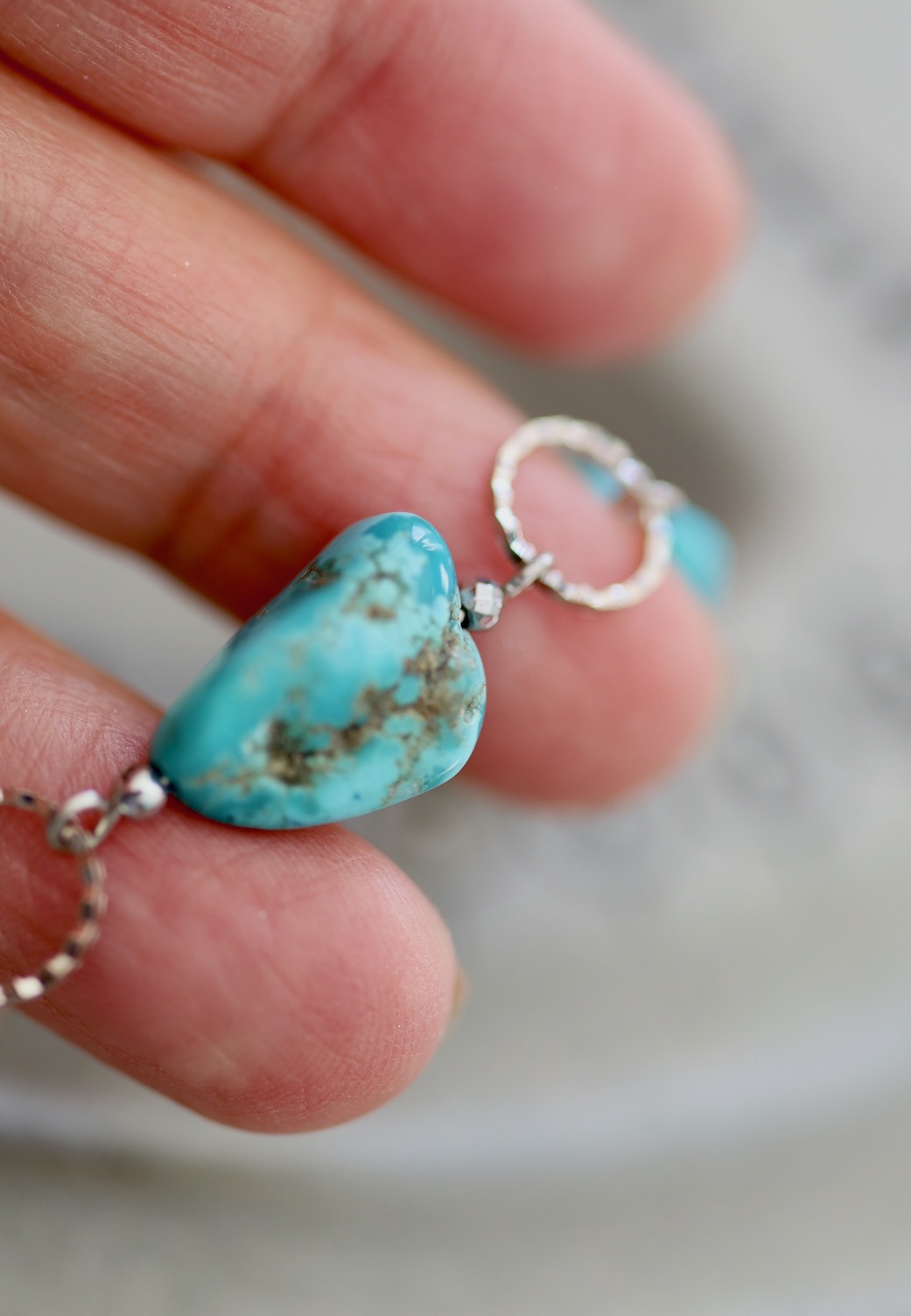 これまでも何度かターコイズを使ったものを作っていますが、石が重いことが悩みでした。今回はターコイズの綺麗な色の印象をそのままに、着けてもとても軽やかなネックレスです。