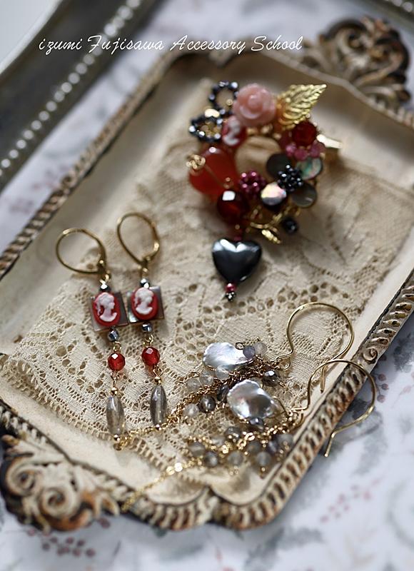 それで、スクールの皆様の作品も小さなものをお願いしました。大きなネックレスではなく、ブローチ、ピアス、リングなど。