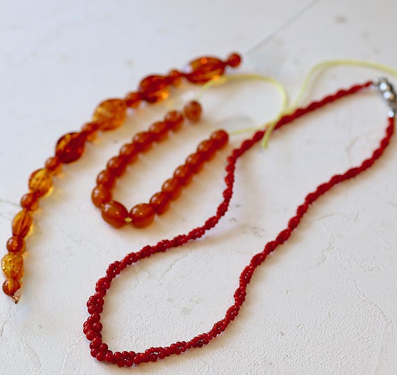 お手持ちの、大きなサイズの琥珀、オレンジ色のビーズ、赤珊瑚を使えるようにしてほしいというご依頼でした。