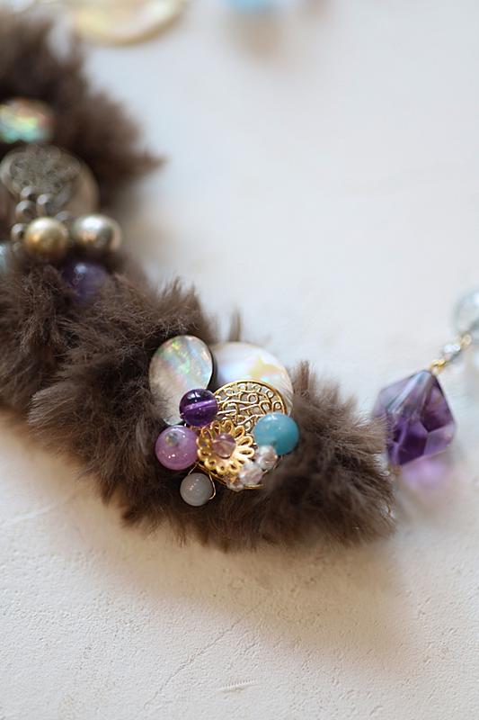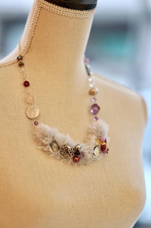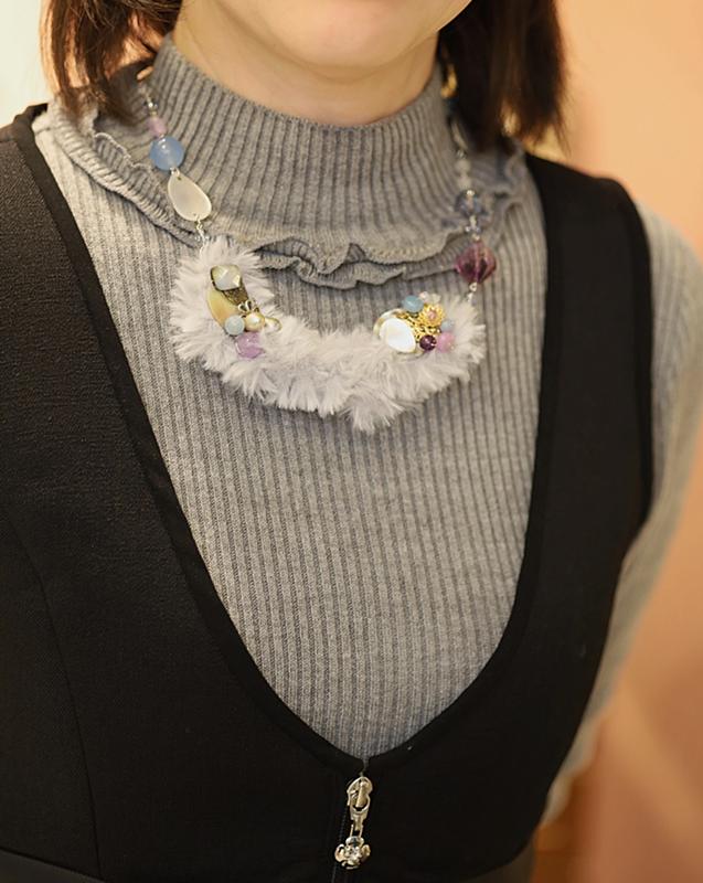 フワフワのネックレス。つける時には下のセーターの色をどうするか、そんなことを考えるのも楽しいですね。