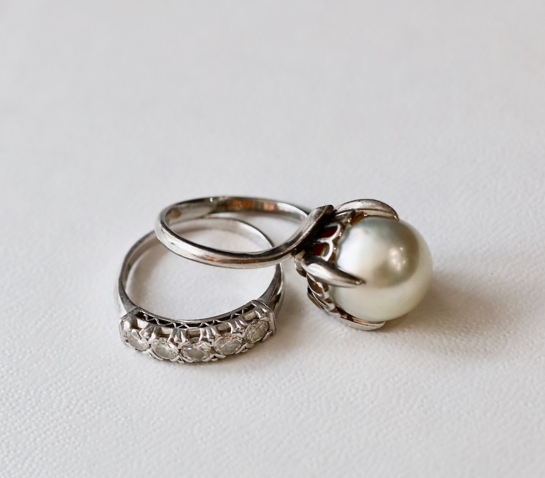 こちらの一文字リングとパールのリングをお持ちになったお客様は、重ねて着けるのも面倒だし1つにまとめたいとおっしゃられて。